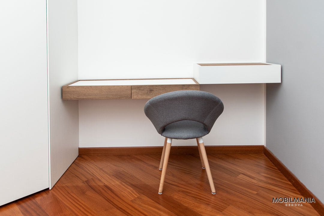 Il modello scelto per l’opera space è la classica AGNESE, dal design con anta a telaio con un tocco di personalizzazione data dallo schienale in alluminio. Per la camera da letto la scelta è stata Tomasella, con il bianco a farla da padrone intervallata dal legno notato chiaro.