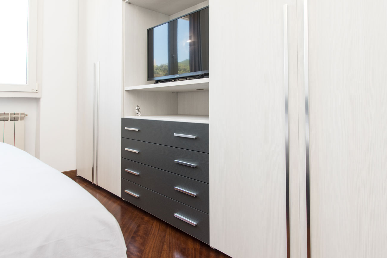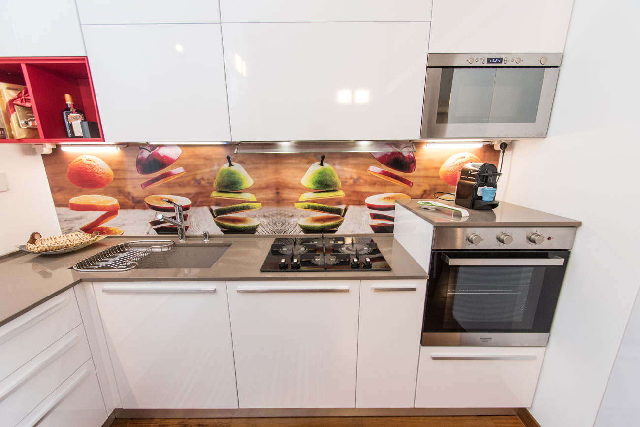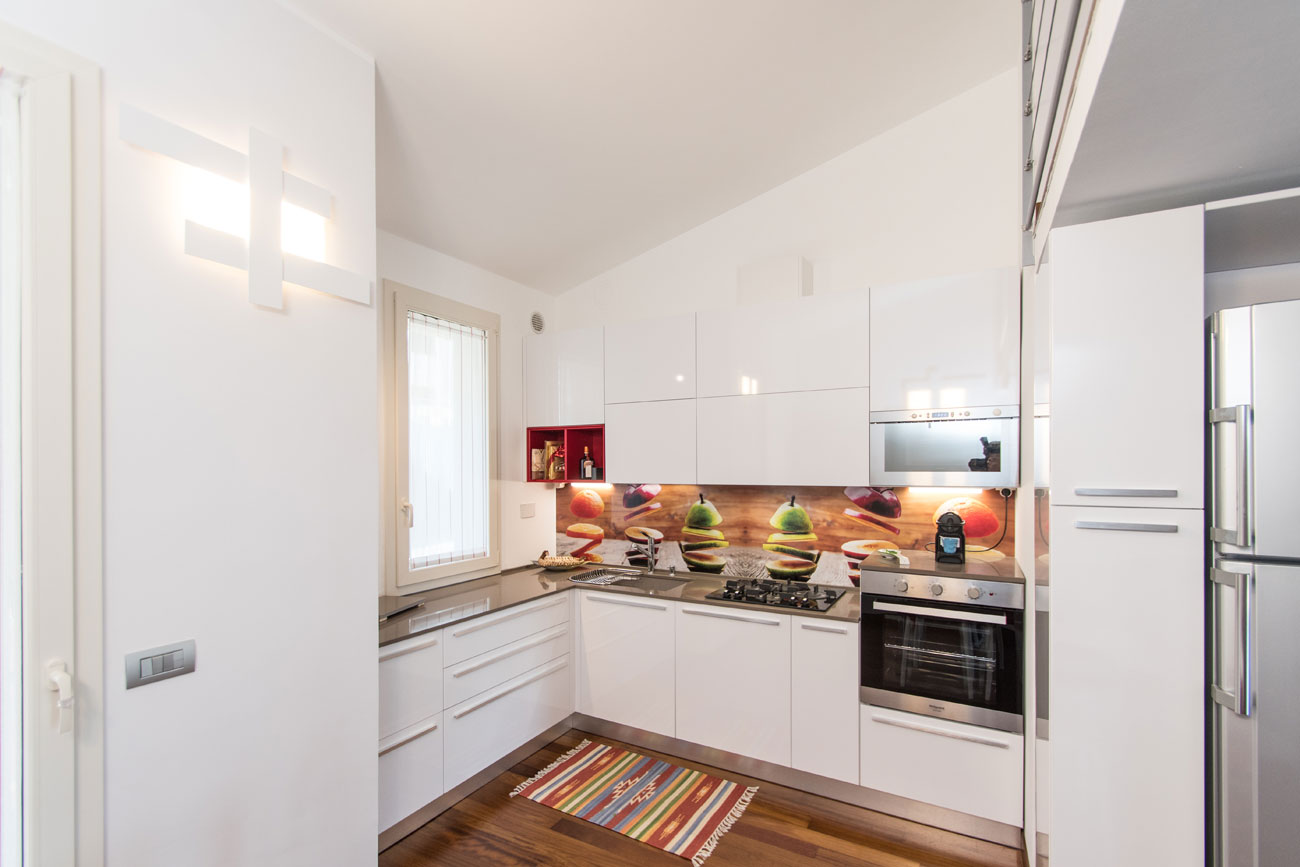 Il modello di cucina è la Noemi di Lube, in bianco assoluto lucido e il top in Okite visone.