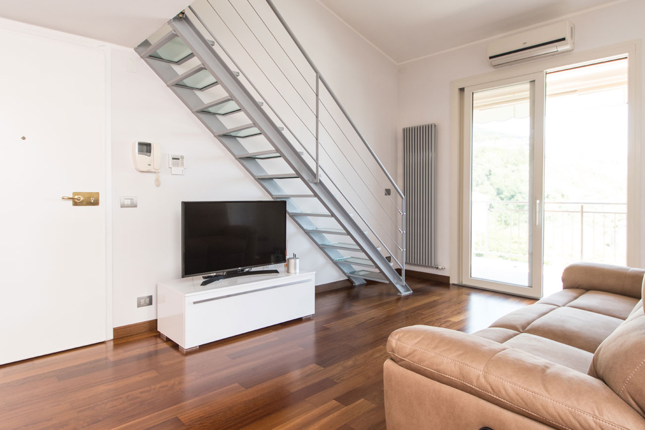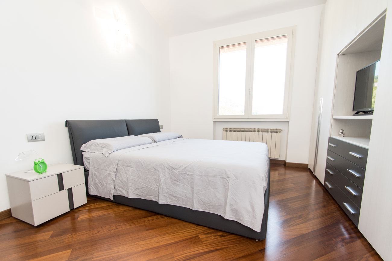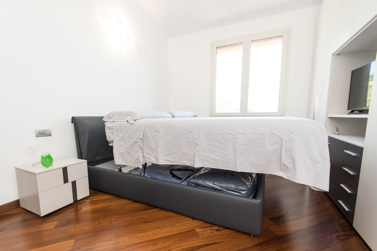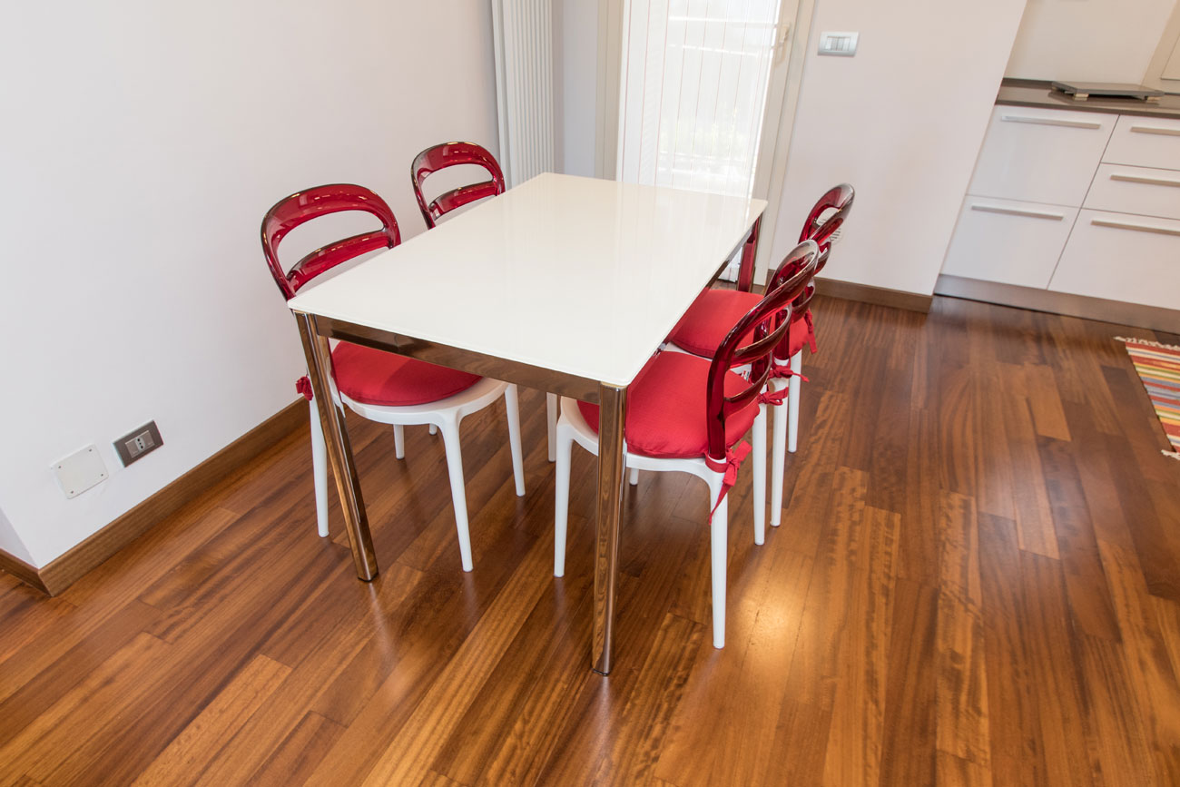 Il modello di cucina è la Noemi di Lube, in bianco assoluto lucido e il top in Okite visone.