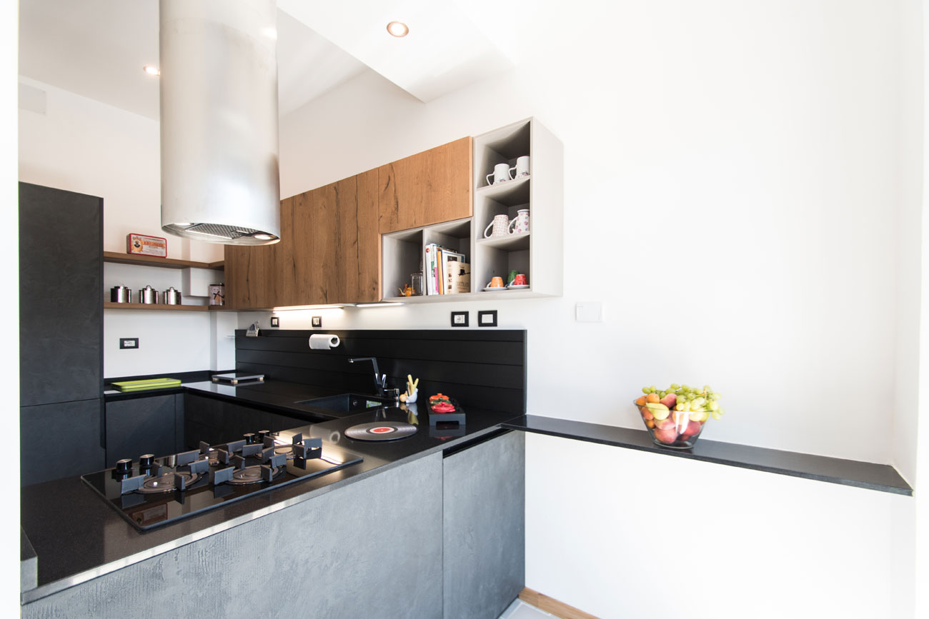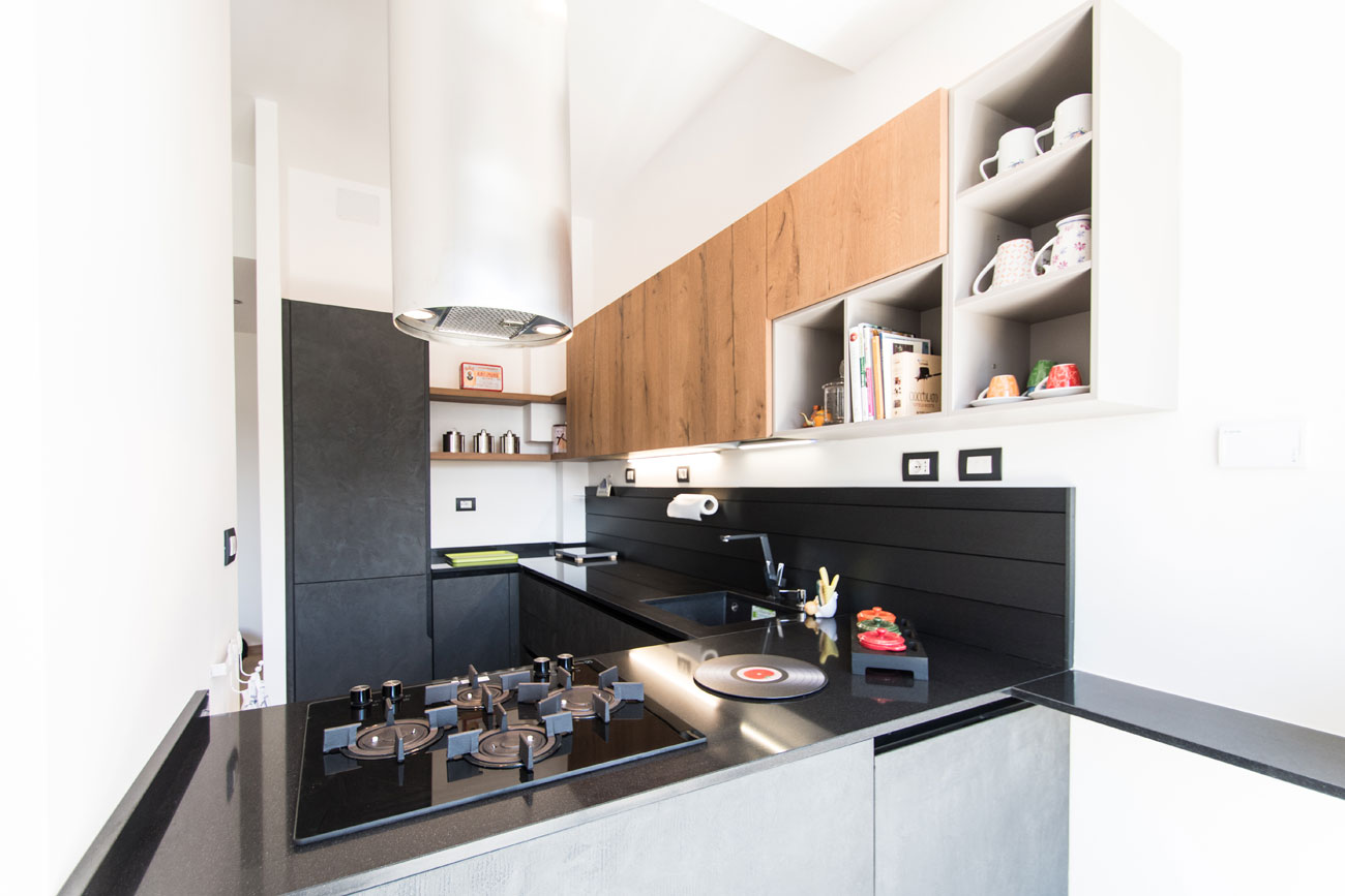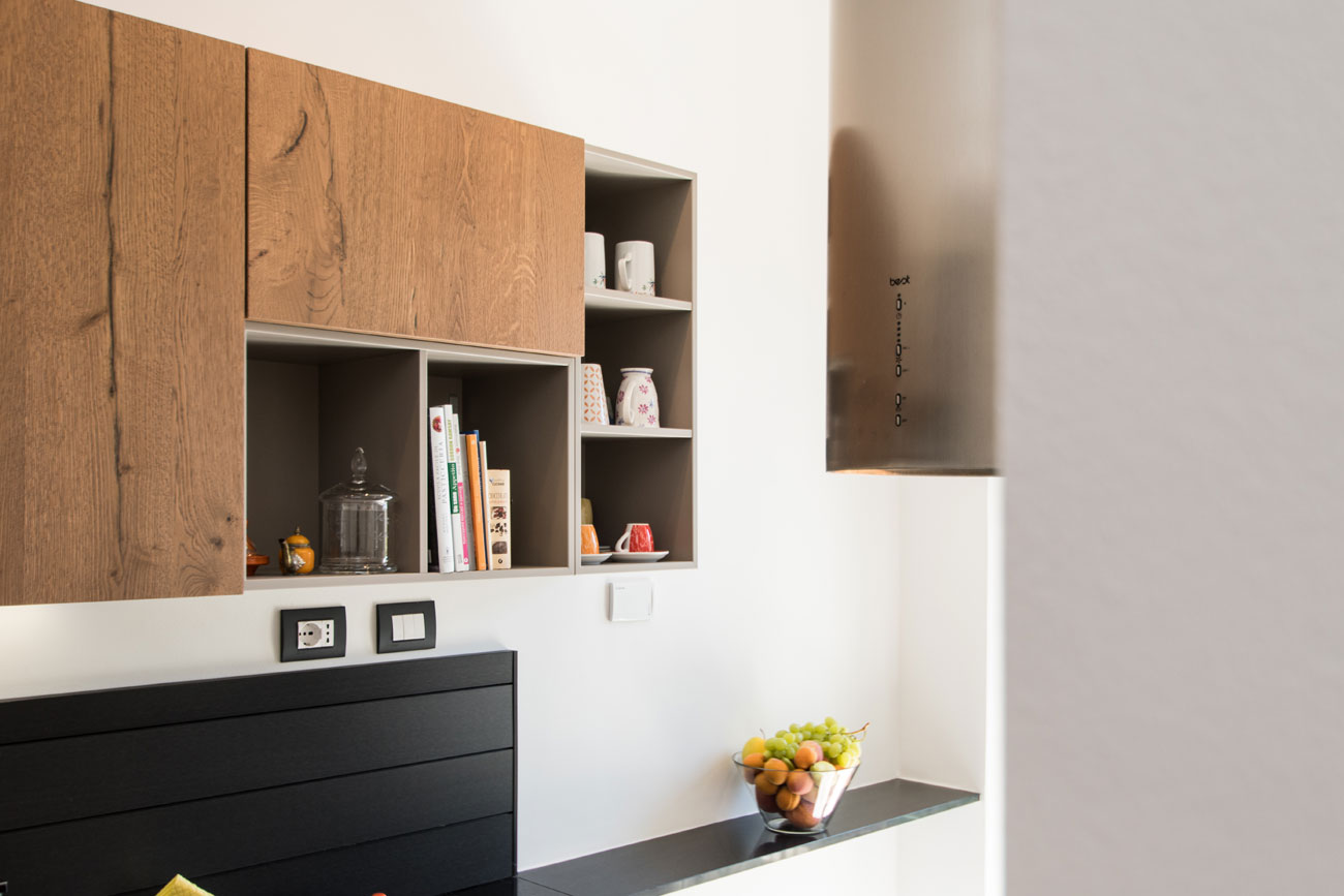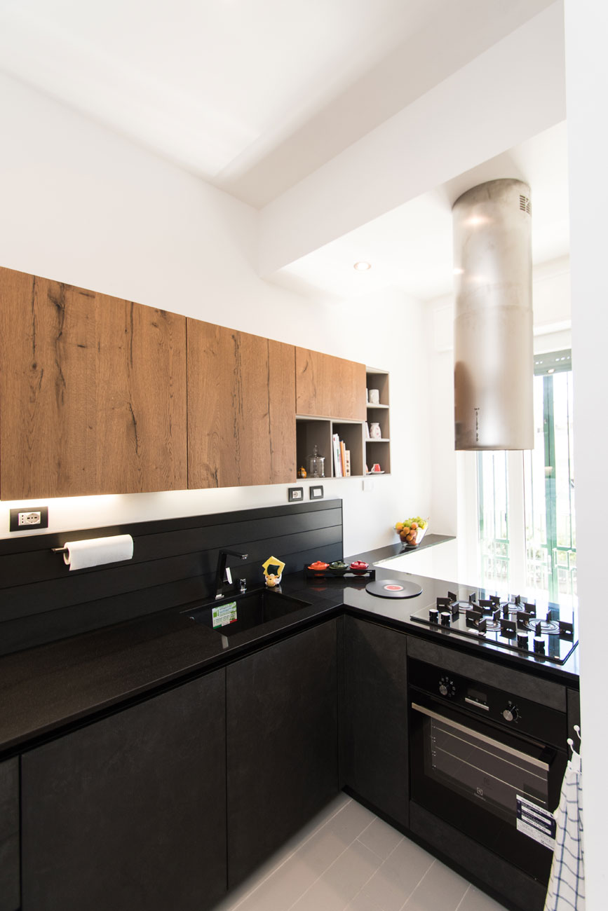 In questa nostra realizzazione le finiture sono il rovere mielato per i pensili e malta “Old Black” per le basi (vera malta cementizia data a mano!), top in Okite e schienale in alluminio nero.