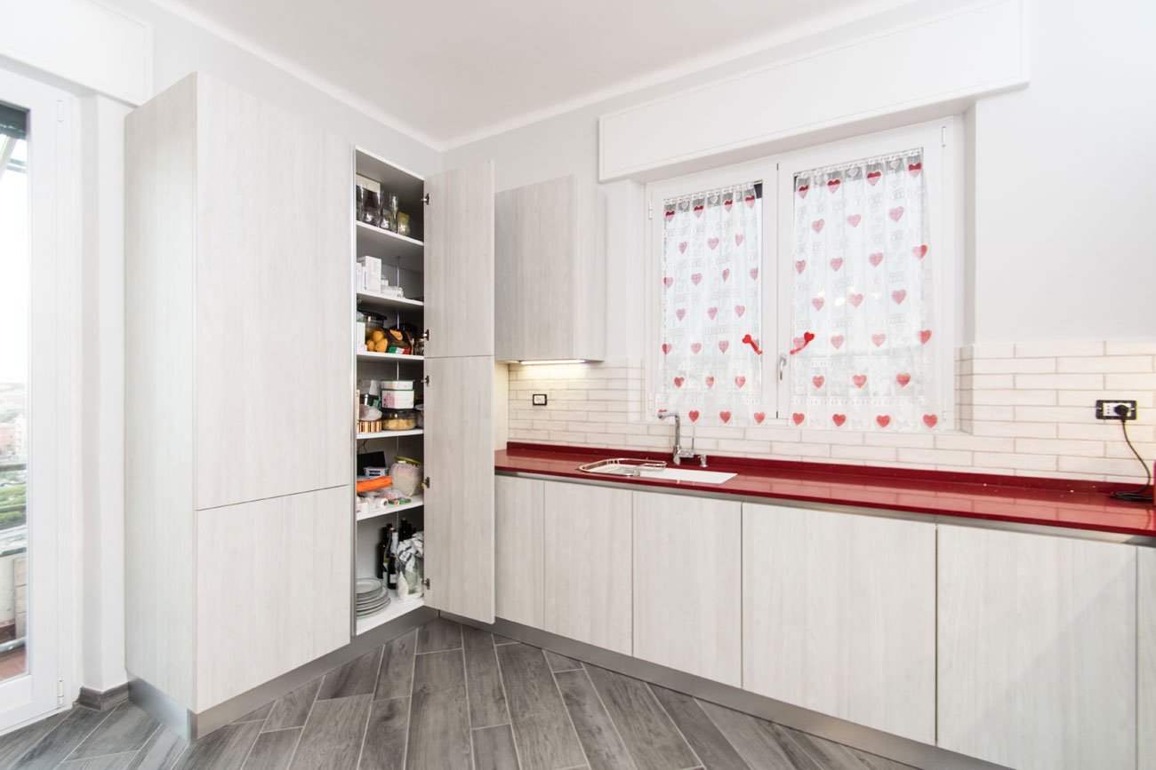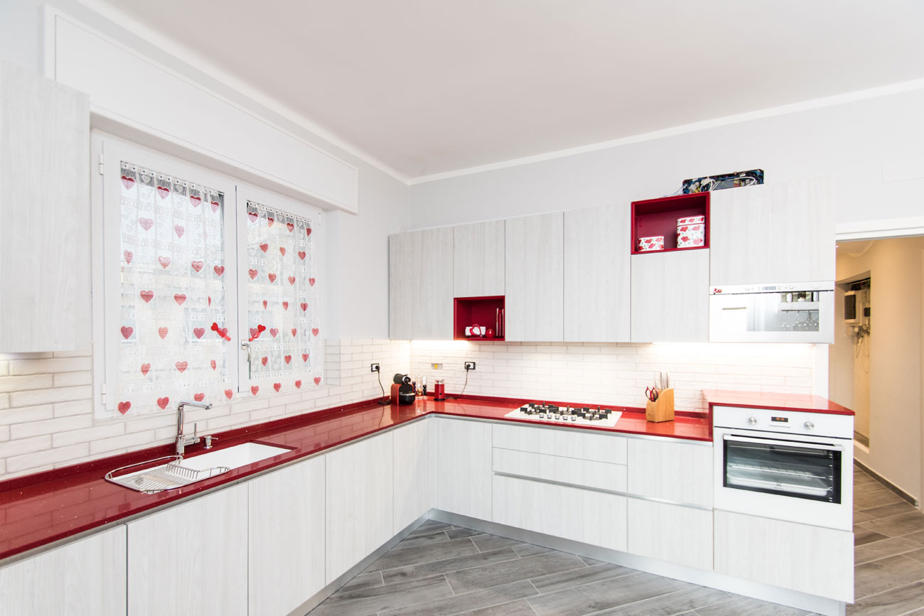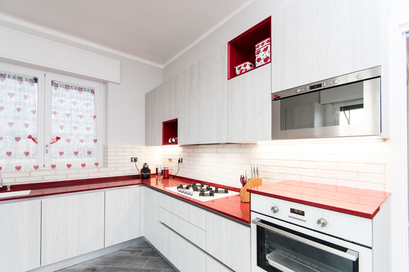 La cucina e il rivestimento alle pareti è stato scelto apposta chiaro per far risaltare al massimo il top in Okite rosso brillante, con frammenti di specchi al suo interno cattura la luce e lo sguardo.