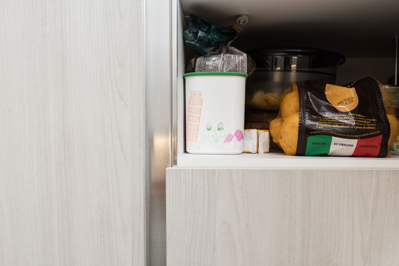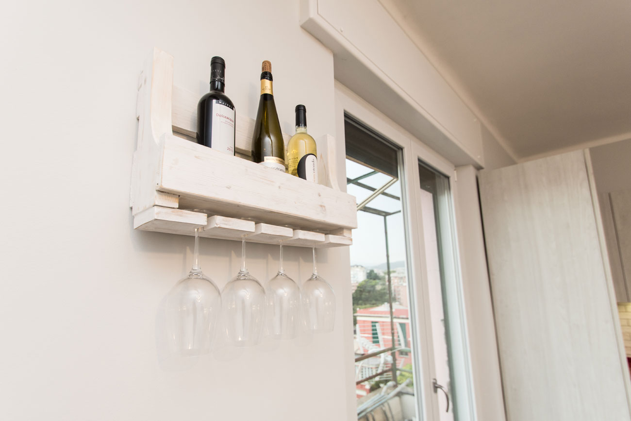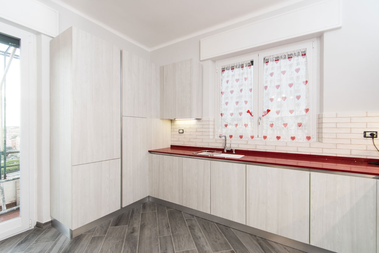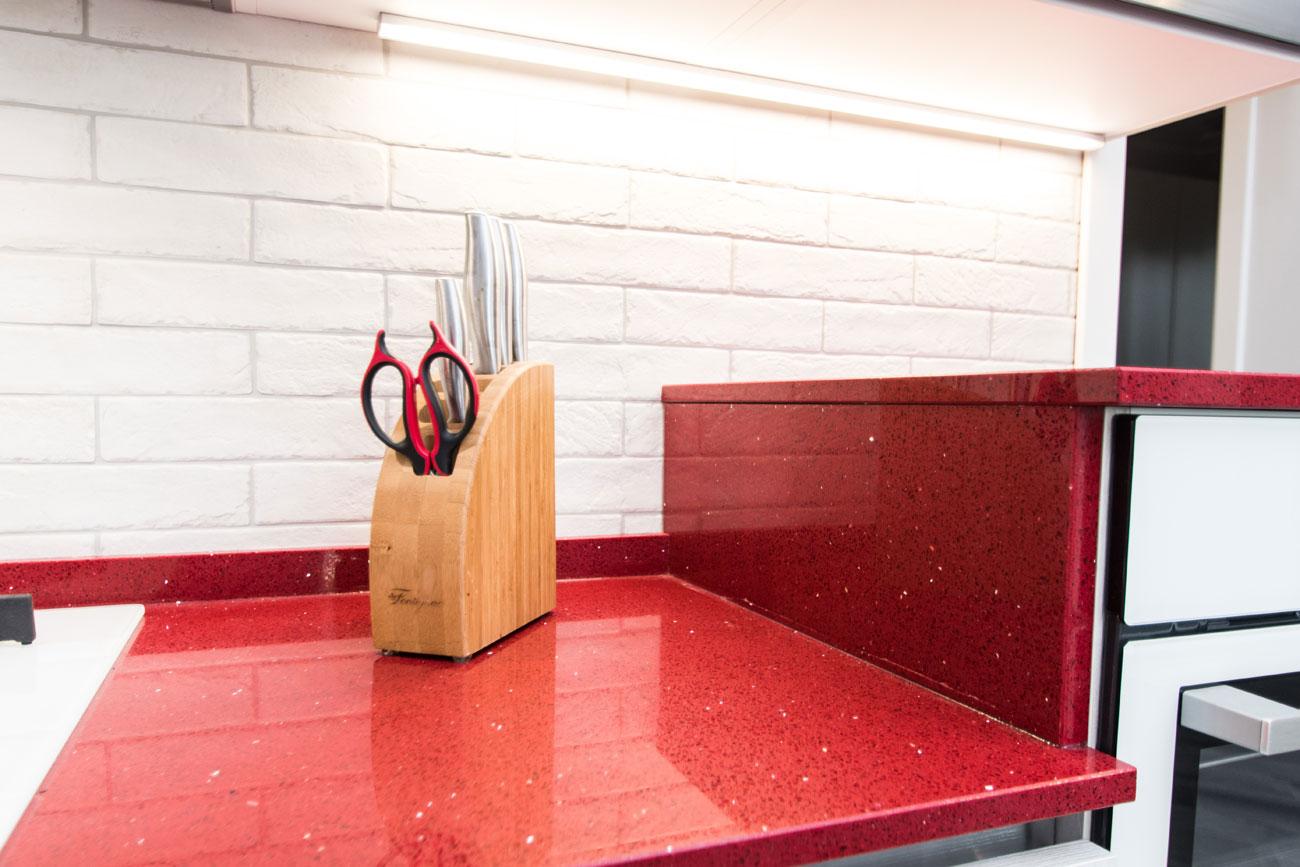 La cucina e il rivestimento alle pareti è stato scelto apposta chiaro per far risaltare al massimo il top in Okite rosso brillante, con frammenti di specchi al suo interno cattura la luce e lo sguardo.