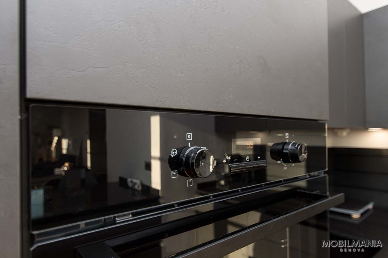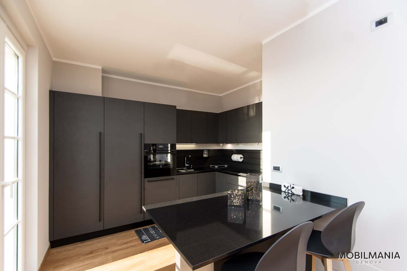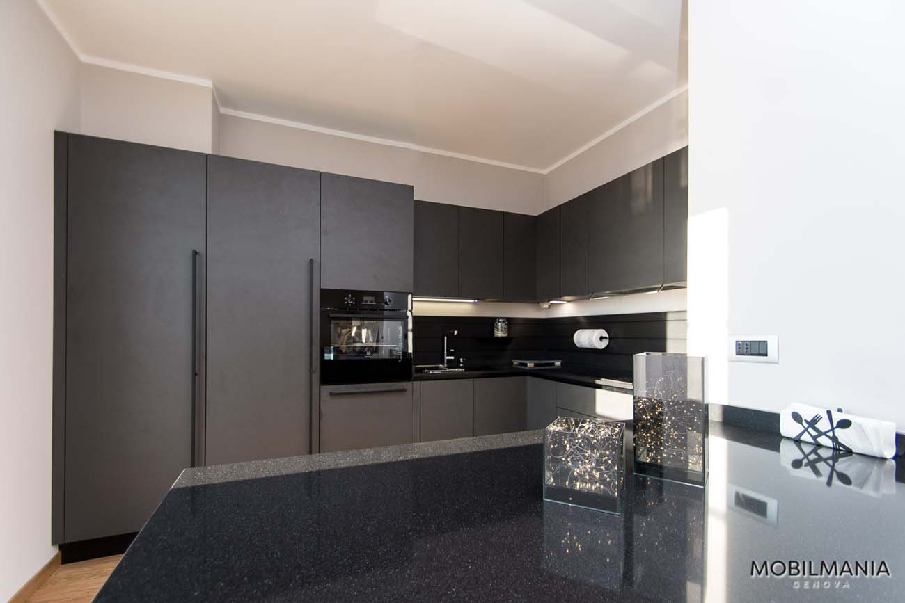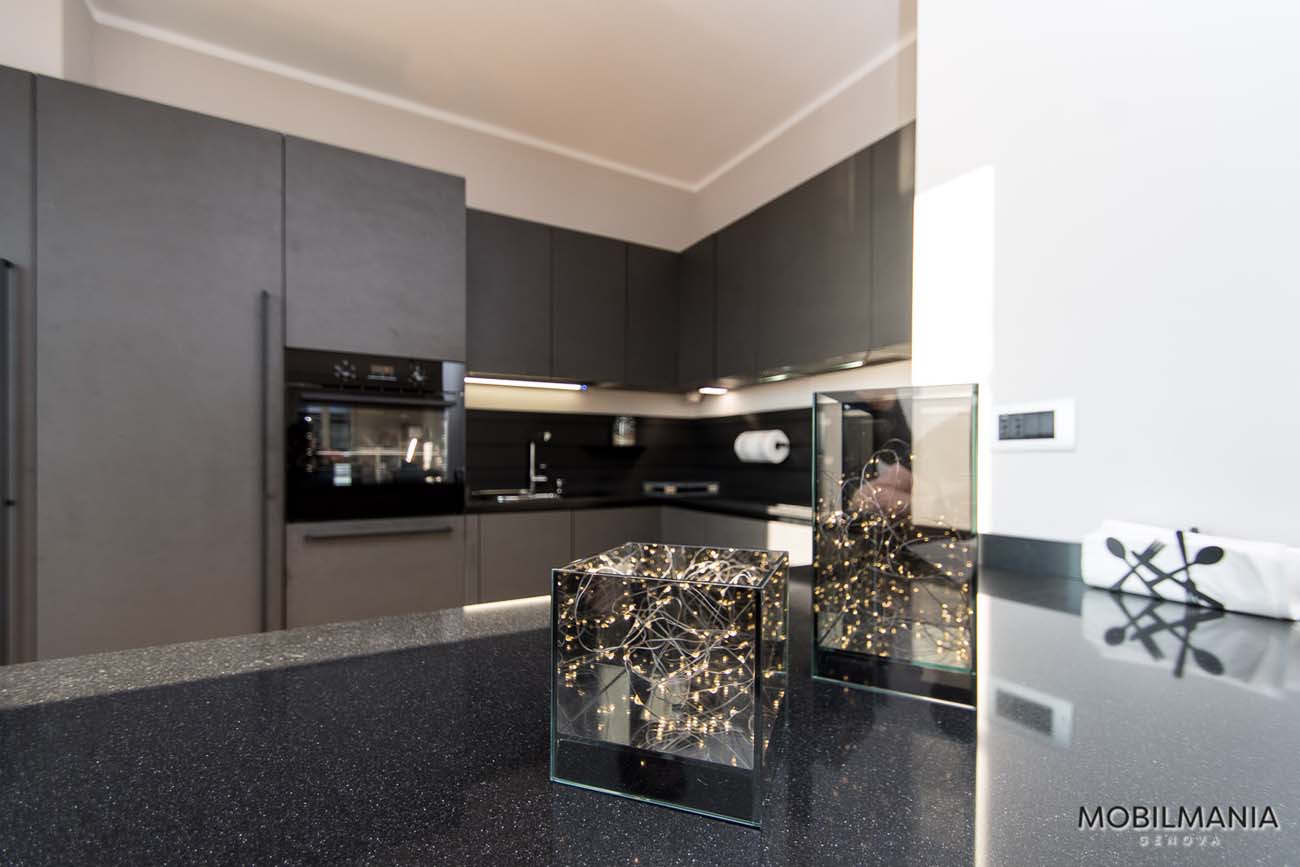 Top in okite nero in continuità con il lavello ed il piano di cottura sempre neri.