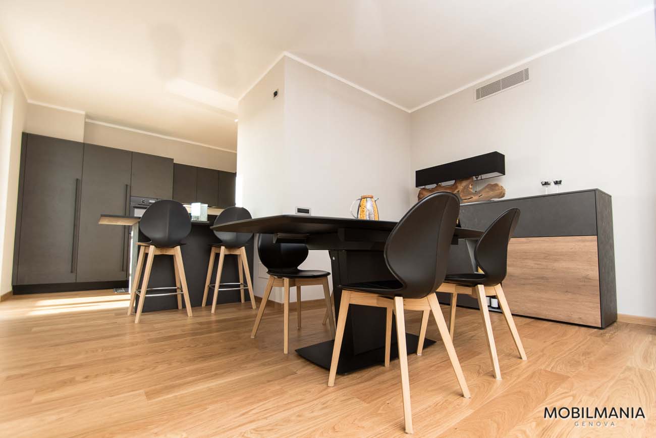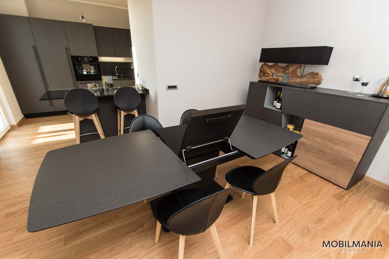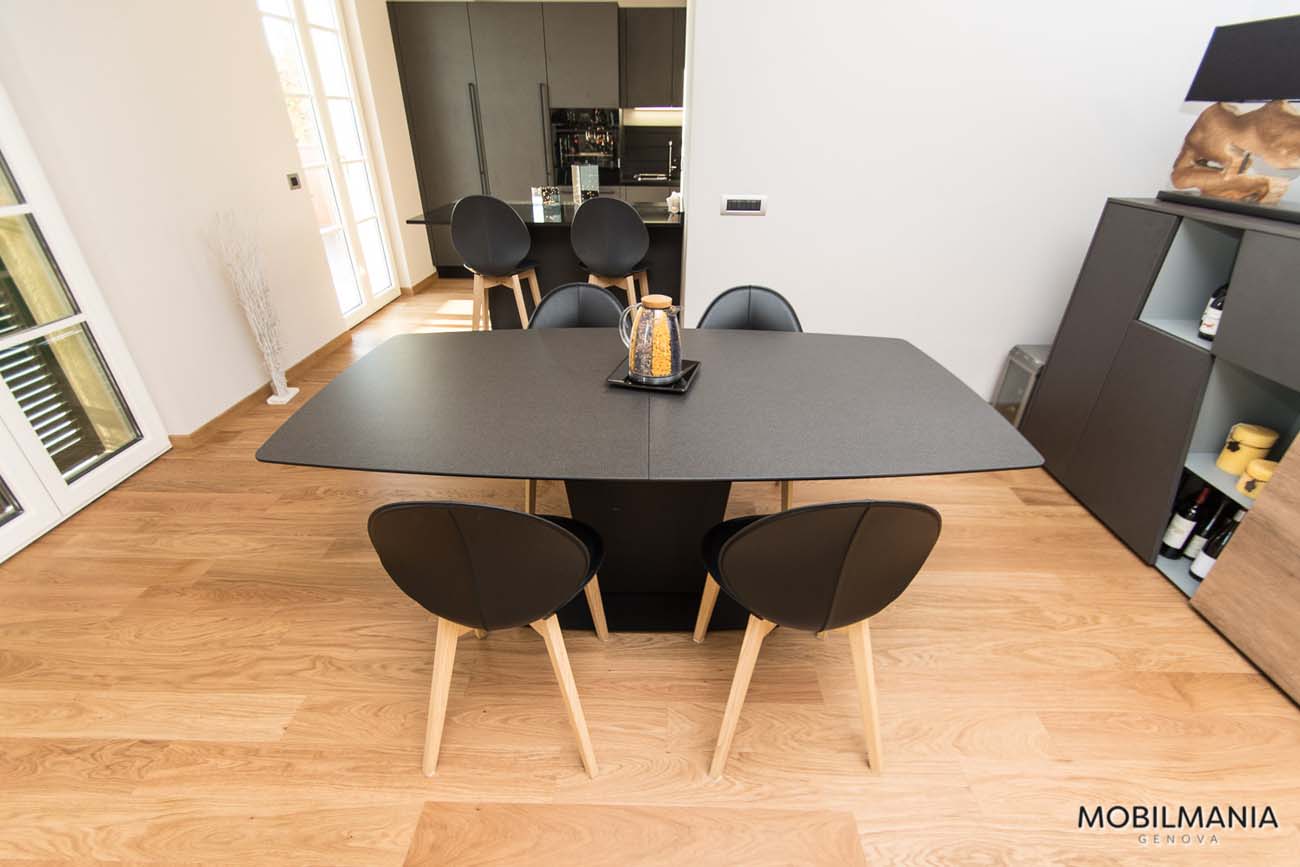 Penisola con 2 cestoni da 120 cm e piano a sbalzo per avere tre comode sedute. Tavolo Calligaris con piano in vetro ceramica antracite e sedie e sgabelli Calligaris BASIL.