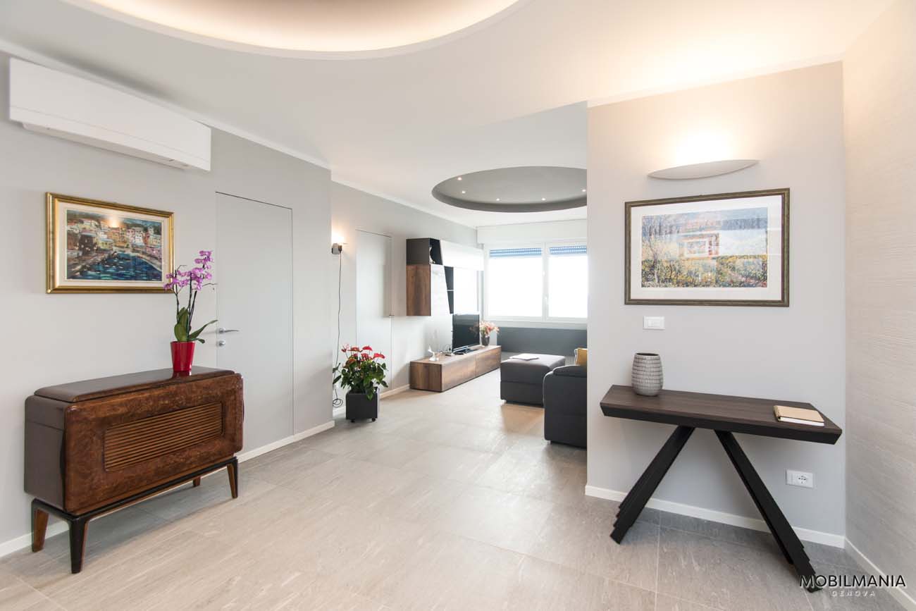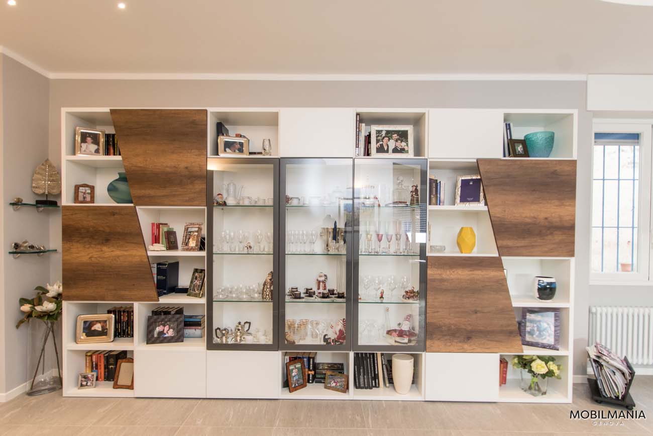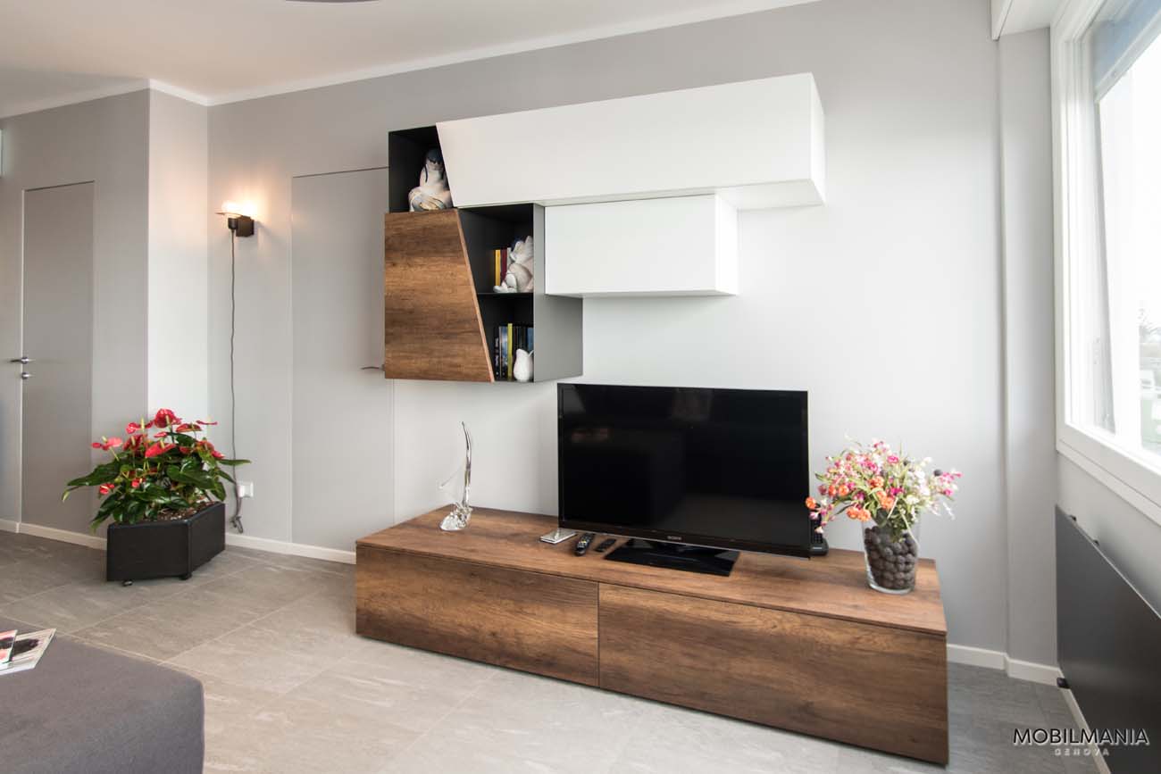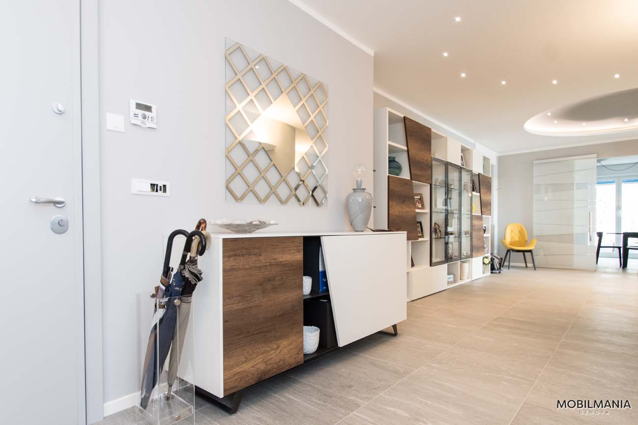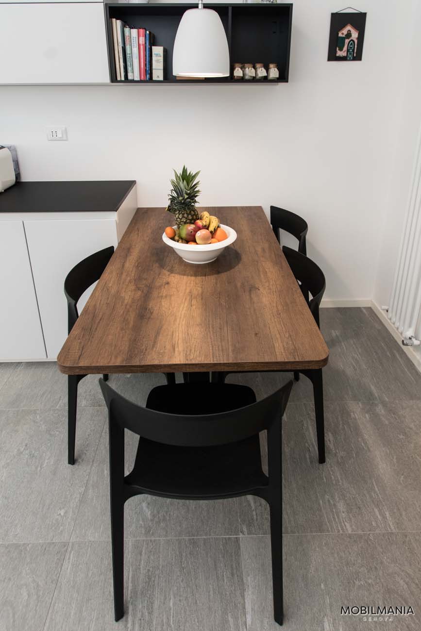 Il filo conduttore di tutta la casa è l’uso del legno nodato scuro presente nella penisola della cucina, nella libreria, nel living e nella madia.
