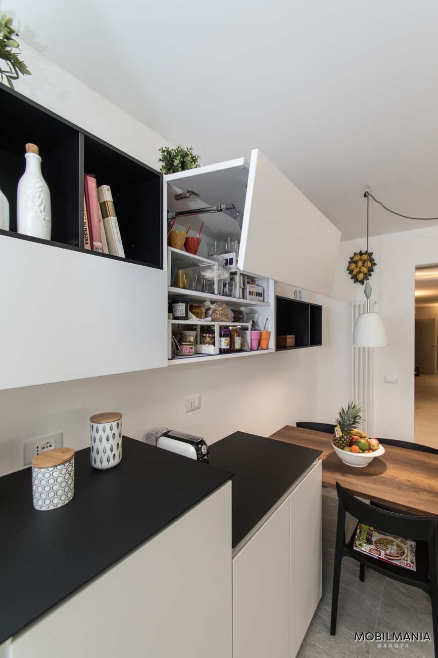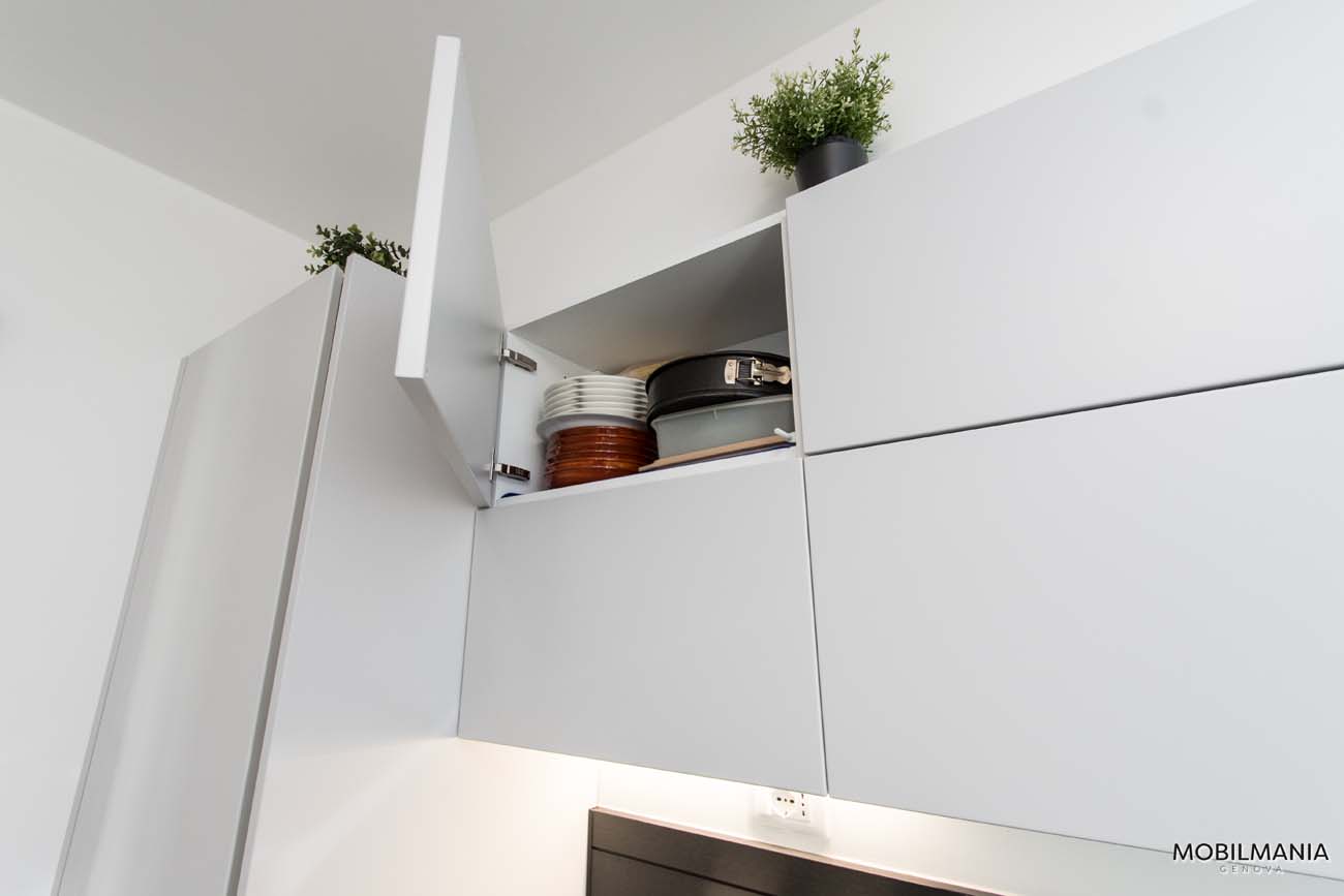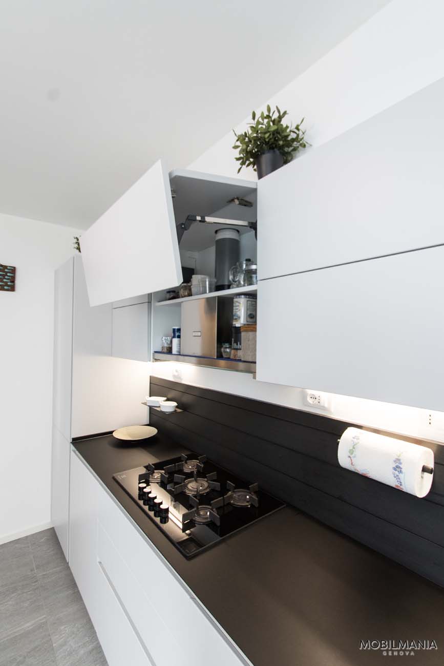 La scelta della cucina è caduta sul modello top di gamma di Lube, ovvero la “Oltre” in finitura cenere opaco con top in fenix nero ed elemento a giorno neri.
