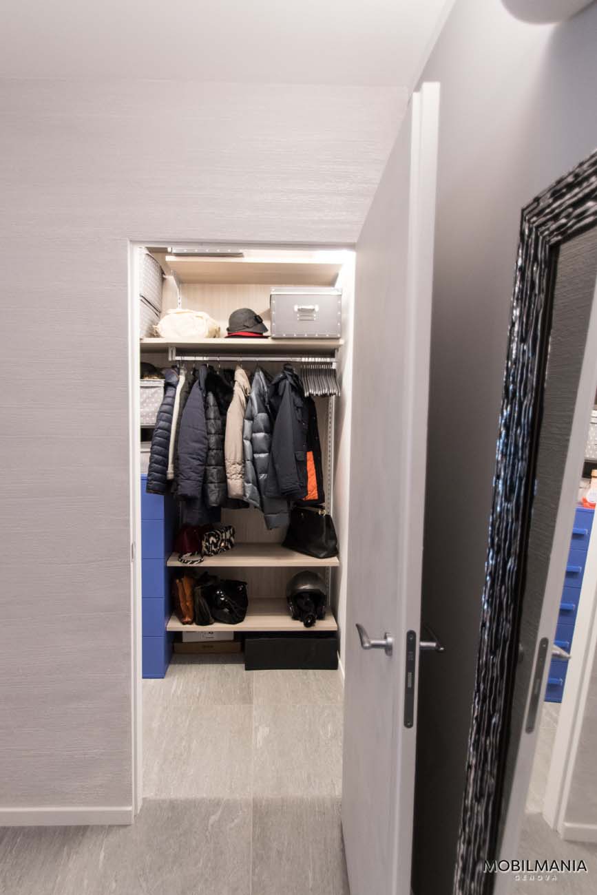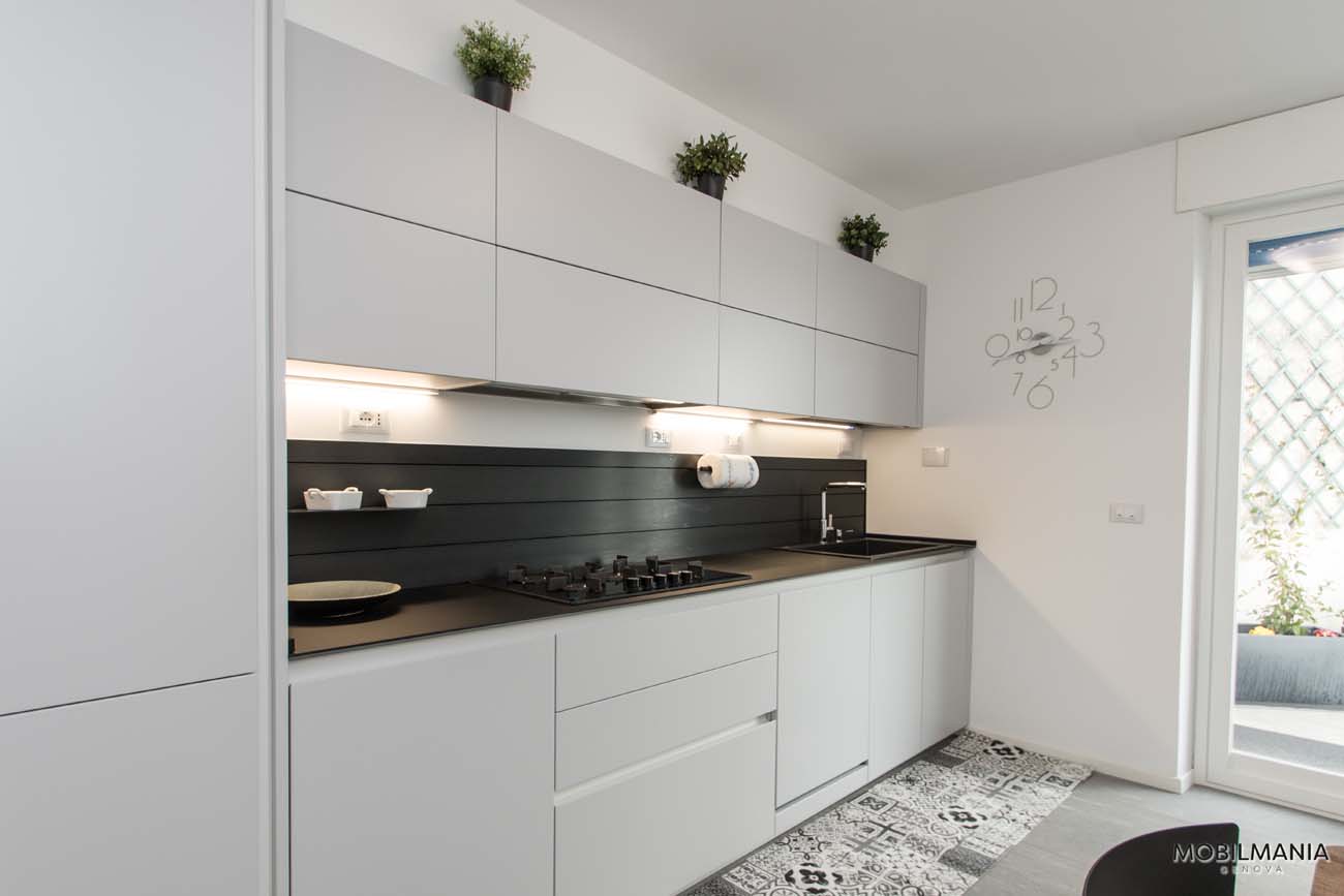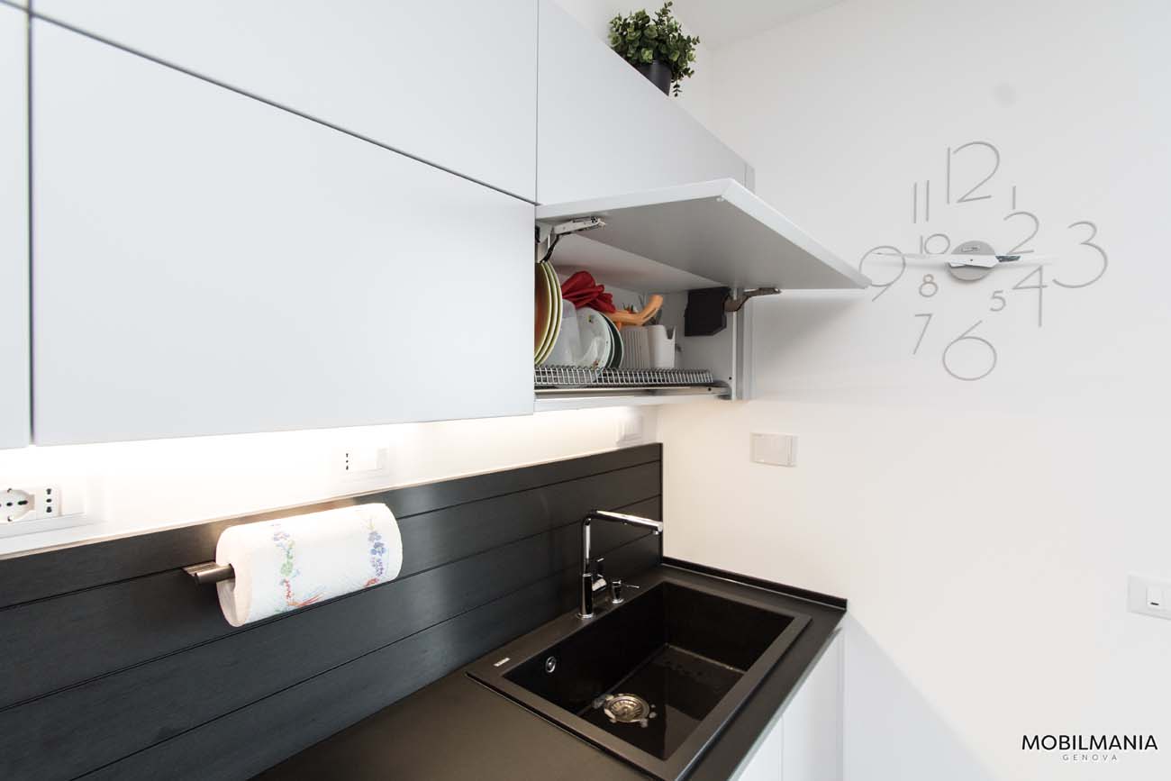 La scelta della cucina è caduta sul modello top di gamma di Lube, ovvero la “Oltre” in finitura cenere opaco con top in fenix nero ed elemento a giorno neri.
