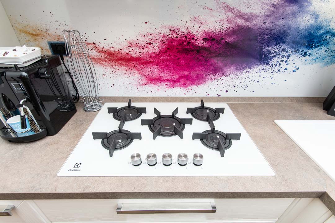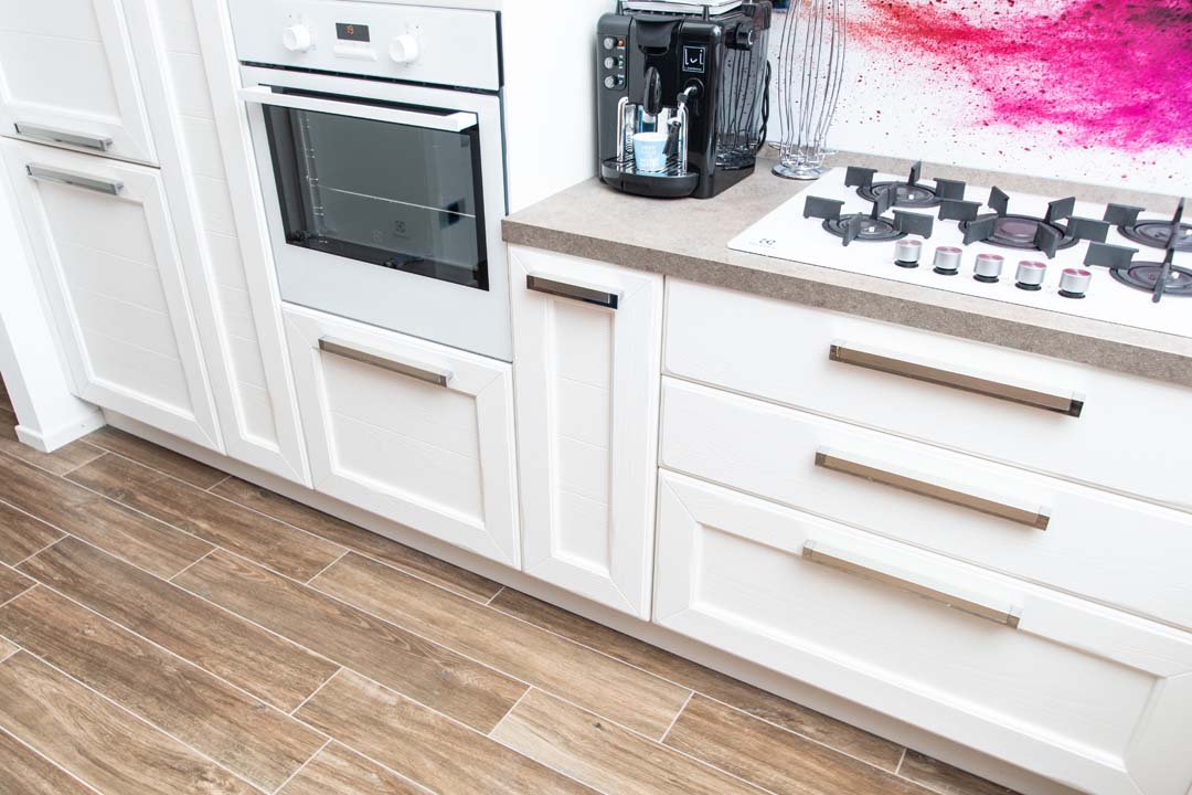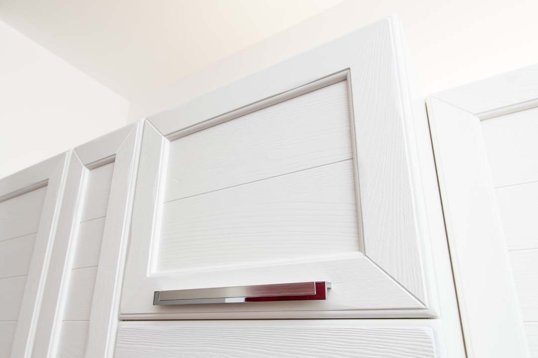 Nel nostro progetto la scelta è stata mantenere un colore caldo come il frassino corda, accentuato dal top in laminato visone.