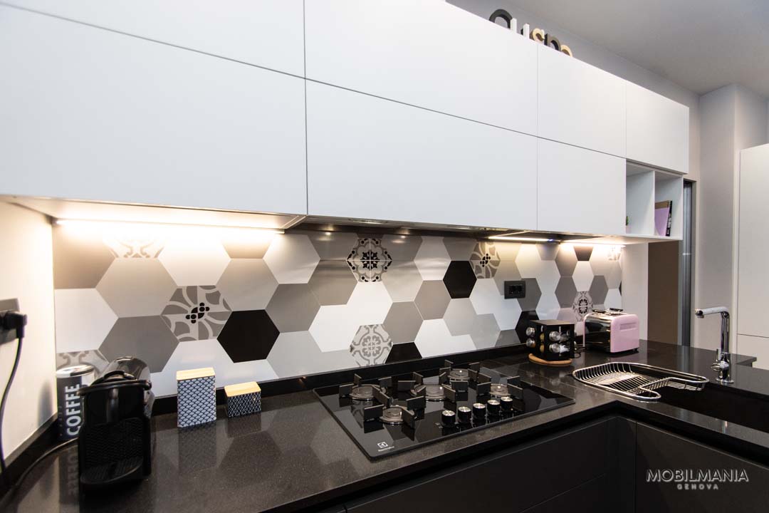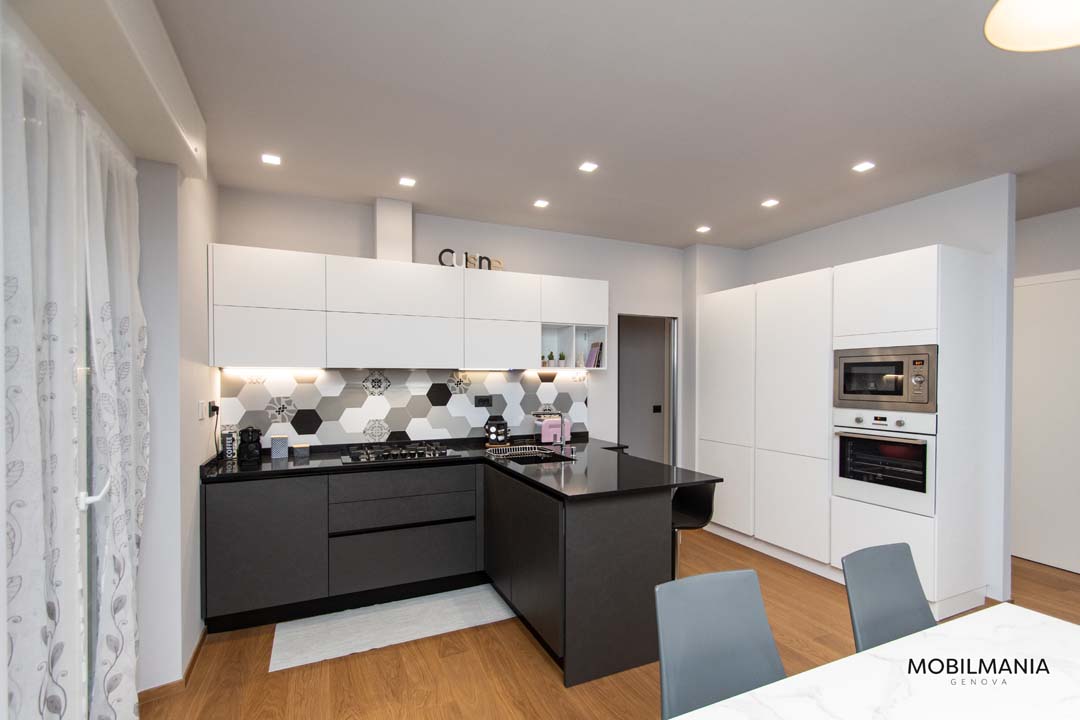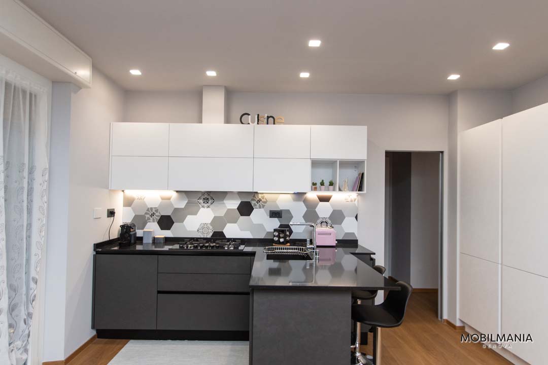 Di grande impatto questa bellissima cucina LUBE Immagina con gola nei colori lavagna malta e bianco cristallo malta. Living Tomasella con colori in coordinato alla cucina!