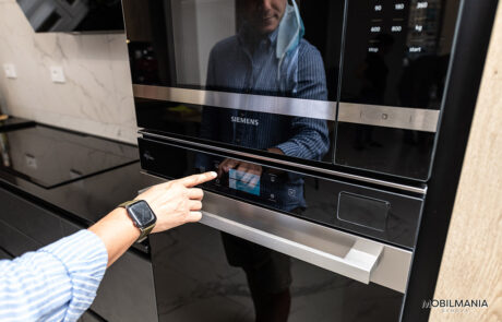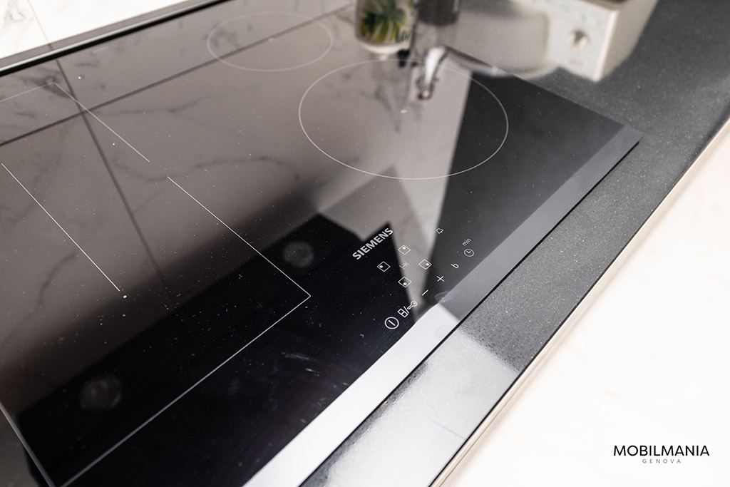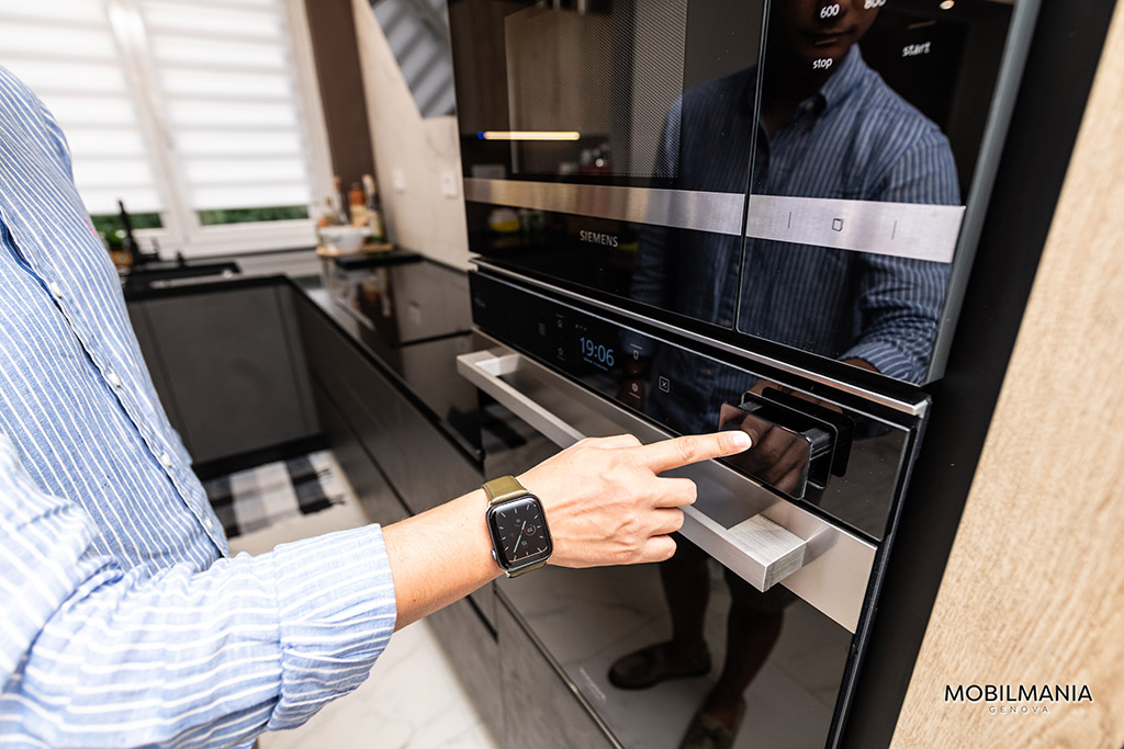 Grande attenzione e cura è stata fatta per la scelta degli elettrodomestici, in primis per il frigorifero da 400 litri largo 75 cm da incasso, il forno 100% vapore , il piano cottura Siemens con zona Flexi e la cappa Elica Stripe in vetro nero.
