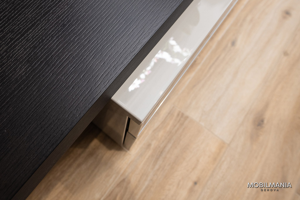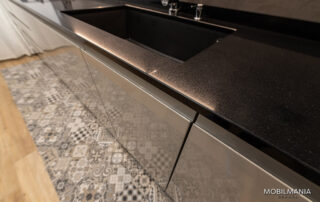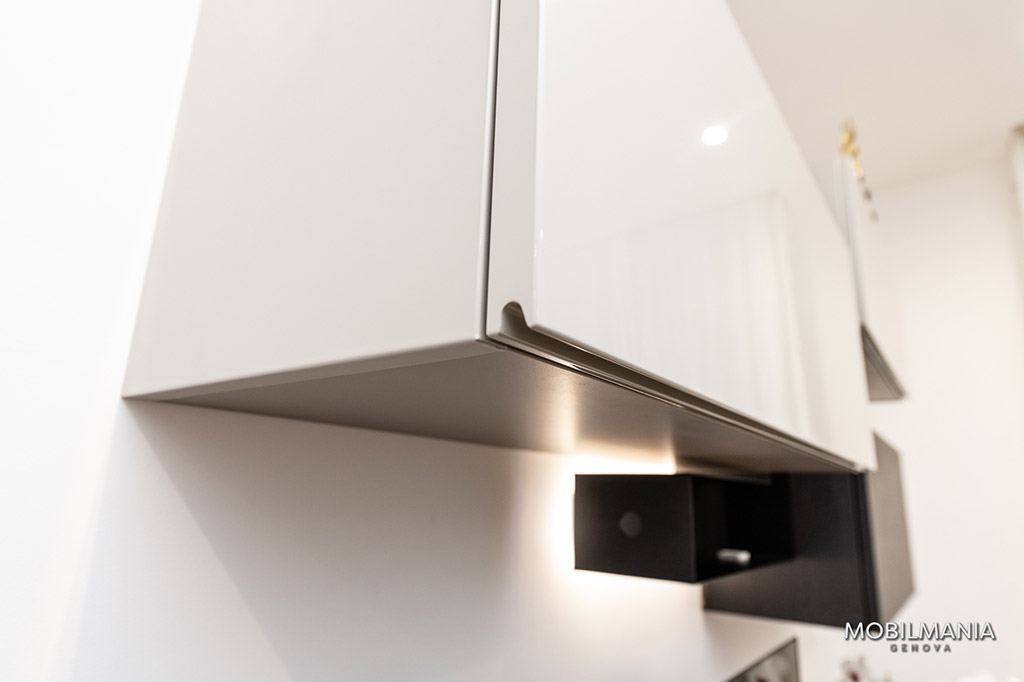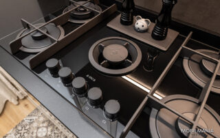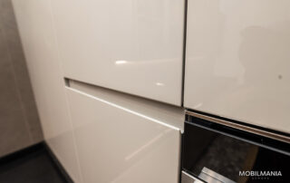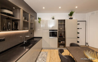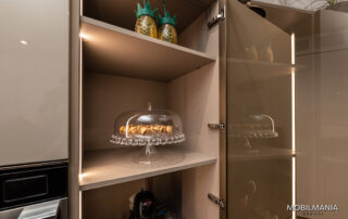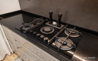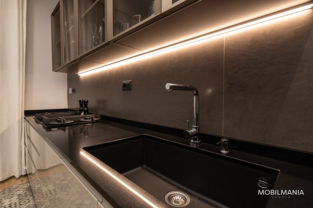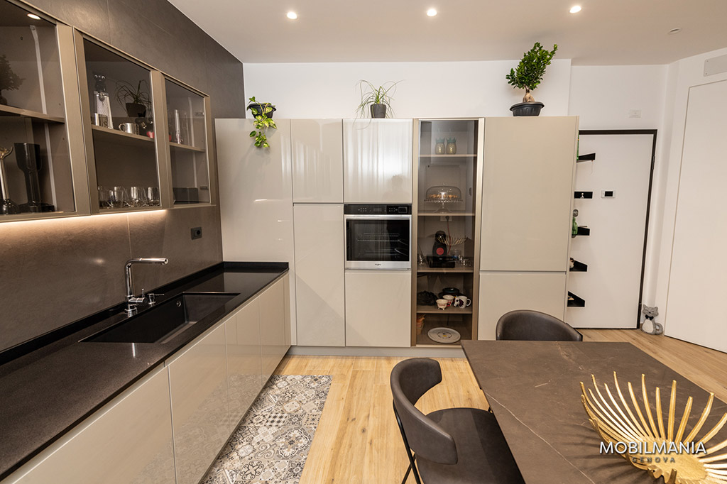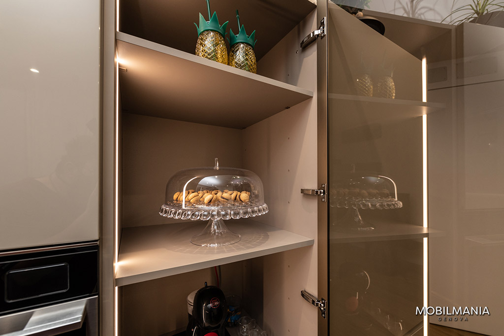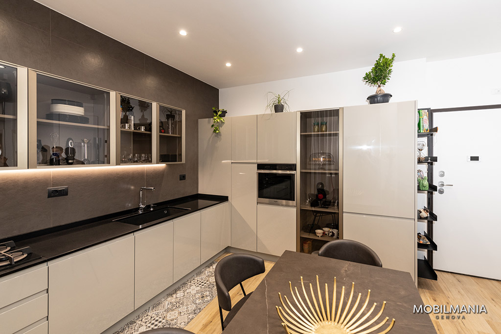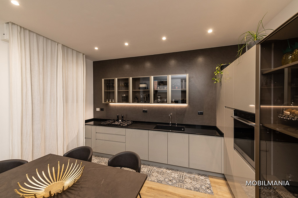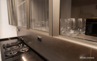 La cucina è il pezzo forte della casa, con pensili in vetro illuminati, piano cottura a gas con cappa integrata, forno a vapore e frigo da incasso largo 75cm con 400 litri di capacità!
