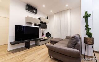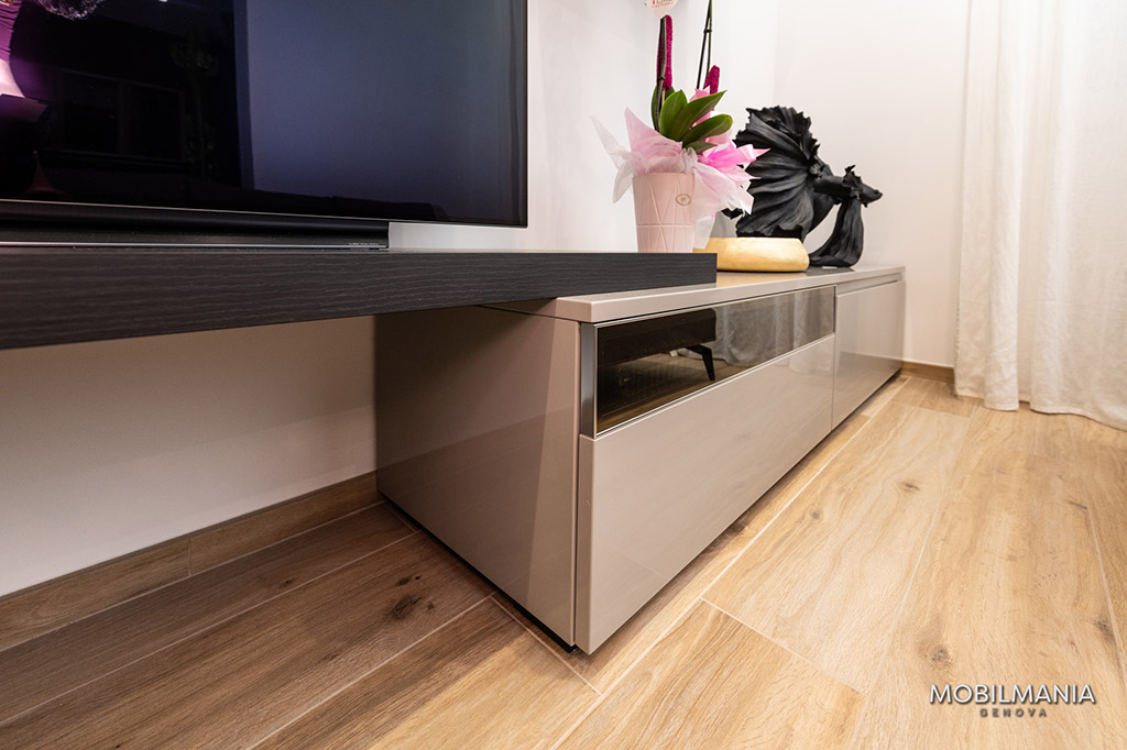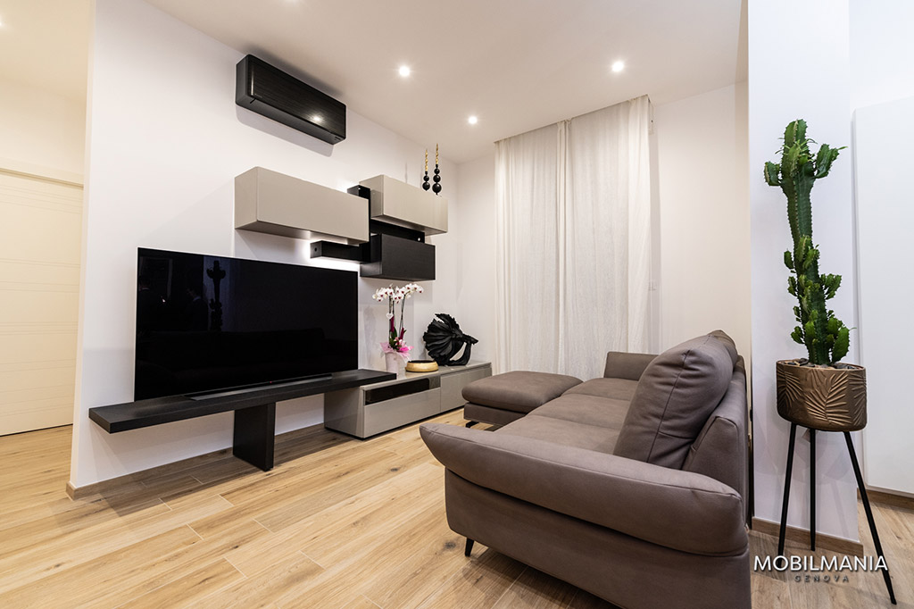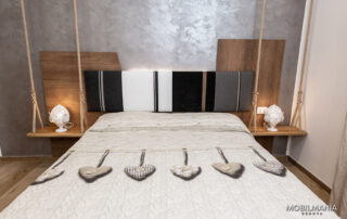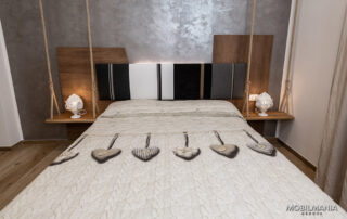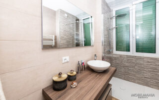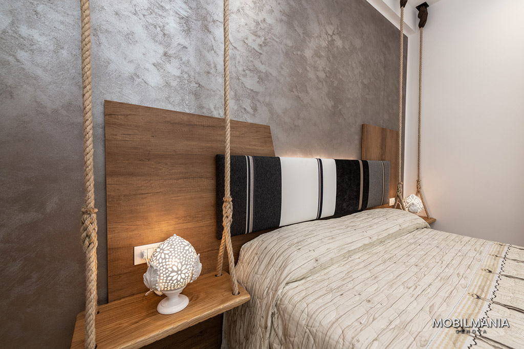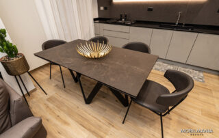 Tavolo Calligaris con piano in ceramica marrone abbinata alle piastrelle della cucina, living Tomasella e camera matrimoniale sempre Tomasella con colori tenui ma di carattere…poi i comodini altalena sono il nostro must!!