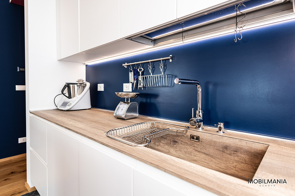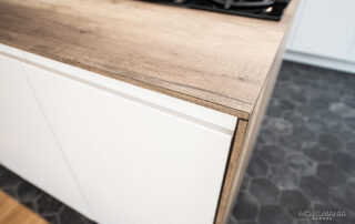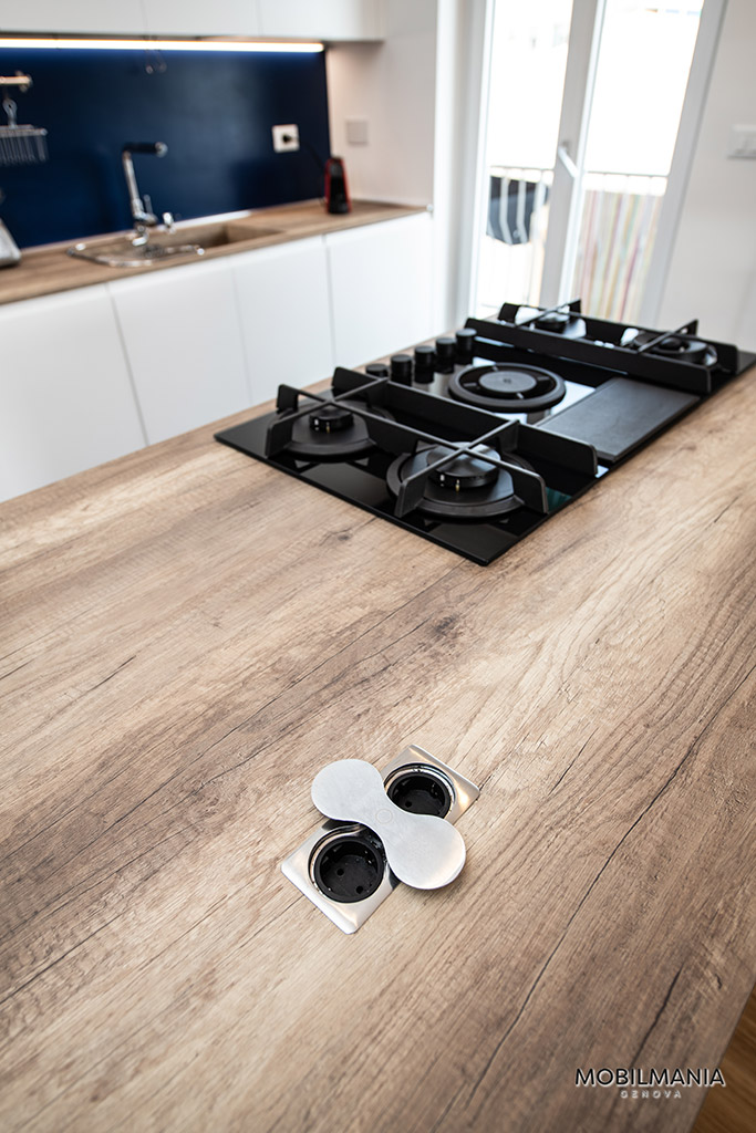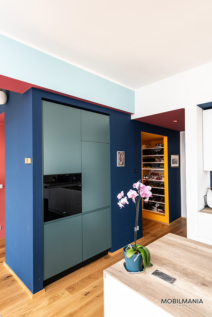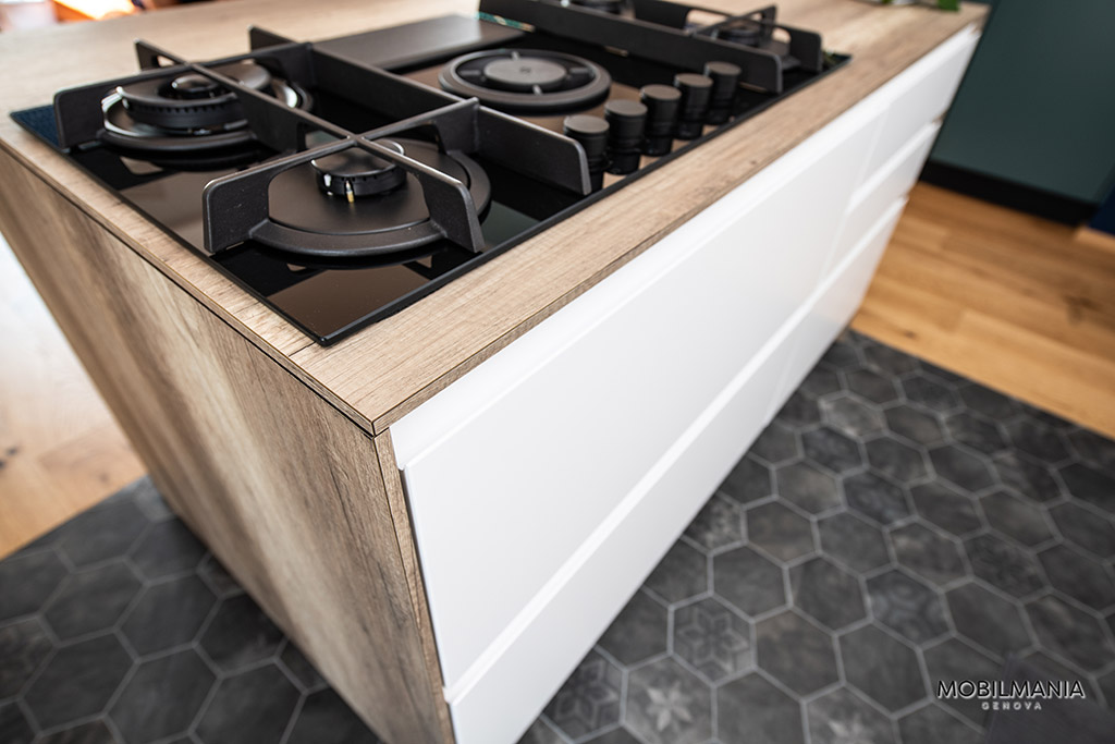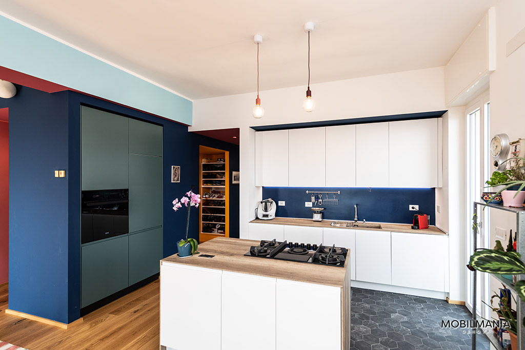 Il colore delle pareti, il contrasto dei pavimenti, il rigore della cucina…tutto miscelato alla perfezione rendono questo nostro progetto incredibilmente accattivante e unico. Il modello è la nostra “Luna” in bianco opaco e verde Positano opaco, con top in HPL color Quercia, usato anche per rivestire i fianchi dell’isola; isola dotata del piano cottura Elica Nikola Tesla Flame con cappa aspirante ad alte prestazioni, design e funzionalità ai massimi livelli.