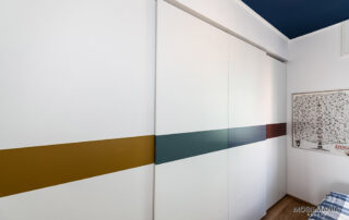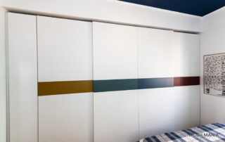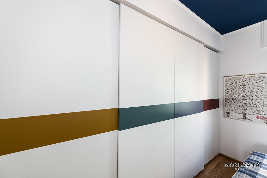 L’armadio segue lo stile delle pareti della casa, bianco ma con colori pastello alternati.